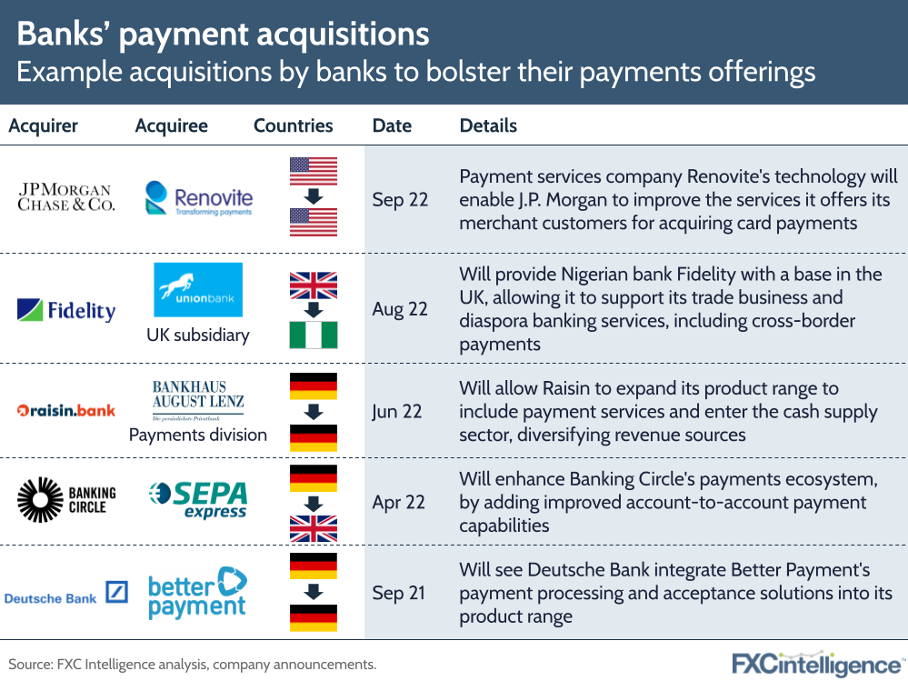 The acquisition is the latest in a number that have given banks additional payment capabilities, suggesting that the space represents an area of potential expansion. For some, the expansion is regional, such as Nigerian bank Fidelity, which has increased its access to diaspora customers with its acquisition of the UK arm of Union Bank.