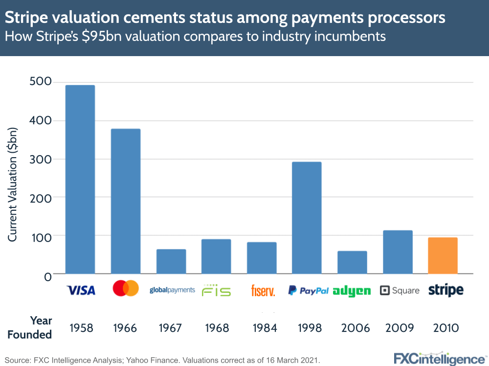 The 11-year-old company is now worth more than 2006-founded Adyen, as well as Fiserv, FIS and Global Payments, who are all decades old. Its surging value also puts it on a course not dissimilar to PayPal, which rapidly became an incumbent after its founding in 1998.