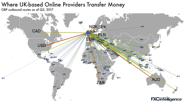 Thicker, orange and green lines indicate more providers offer a specific route – such as the GBP to EUR/USD/AUD corridors. Thinner, bluer lines indicate corridors offered by only a handful, or less, of providers – such as UK to Tonga. Some of the more surprising corridors (suggesting potential opportunities) are GBP to Singapore Dollar, Kenyan Shilling, Swedish Krona and Sri Lankan Rupee.
