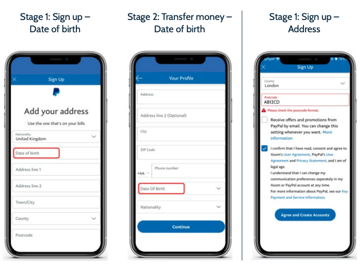 Both Xoom and Ria take a longer time to complete the ‘Stage 2: Transfer money’ than WorldRemit and Wise, even though KYC details have already been checked during the signup. Notably, Xoom asks for the date of birth of the user twice, at both of these stages (shown in Figure 3).
