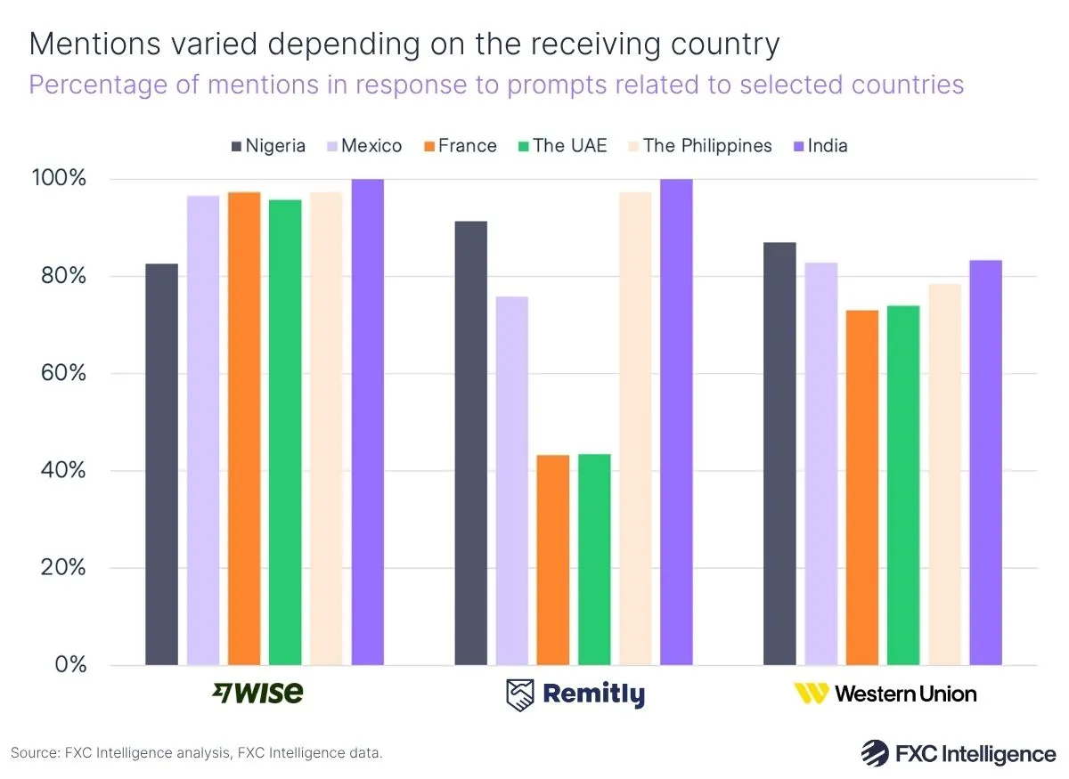 Of prompts asking the AI models to find the ‘best’ way to send money to a certain region or the best company to facilitate money transfers, Wise topped the list for responses, featuring in 94% of all answers to these requests, narrowly beating Western Union (91%) and Remitly (87%).