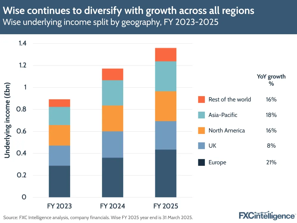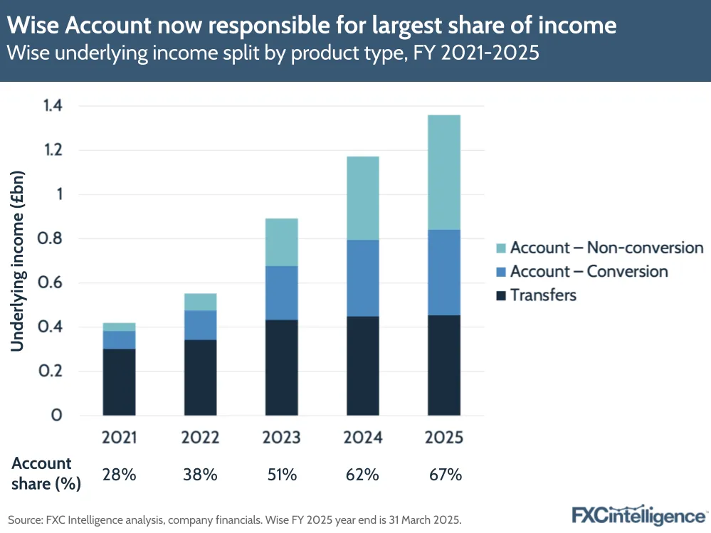 Income for Wise Account – its multicurrency account offering that allows customers to hold money in 40+ currencies as well as spend it using a debit card – has grown substantially faster than transfers income over time, with a 66% CAGR between FY 2021 and 2025. This is also faster than Wise’s overall rate of income growth during the same period (34%), signalling the company’s significant shift away from being transfer-led to account-led.