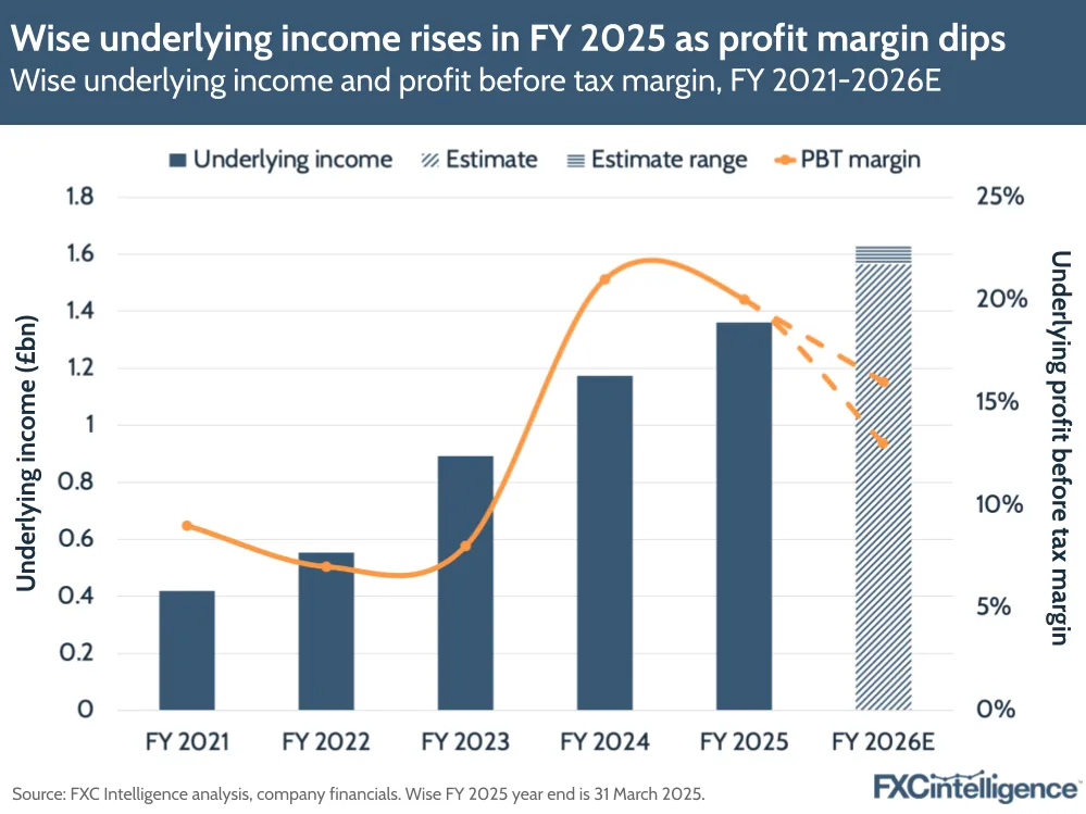 Despite high investment, Wise continues to see a positive profit-before-tax (PBT) margin of 20% – down one percentage point compared to FY 2024, but still at the high end of its expected range for the year. Calculated against its underlying income, this gave the company a PBT of $272m in FY 2024.