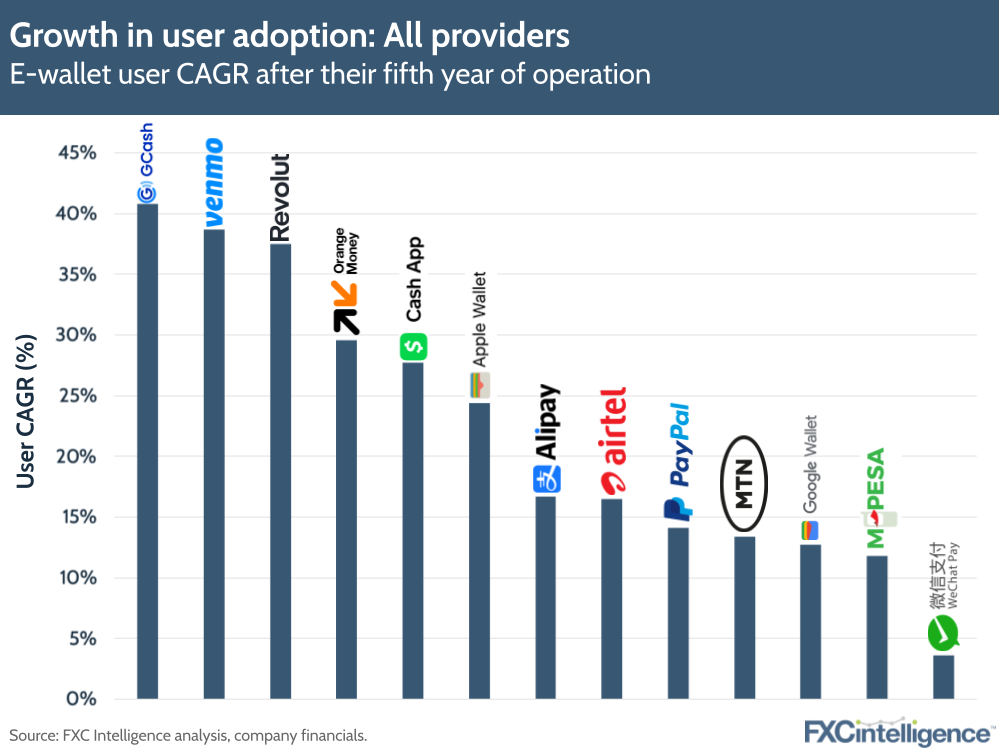 In the medium user adoption group, GCash and Venmo have been the fastest growing, while MTN Mobile Money and M-Pesa are tied for relatively slower growth. Of note is the fact that GCash is the fastest growing of all providers, across both groups, with a CAGR of 41% since its fifth year.