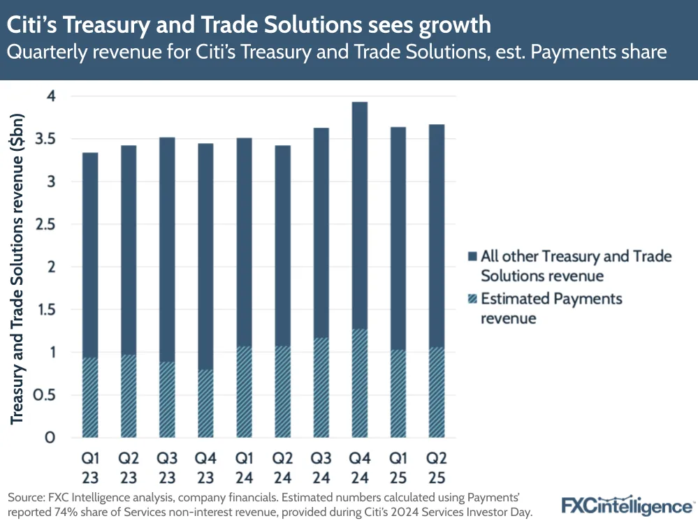 At last year’s Services Investor Day, Citi said that Payments had a 74% share of the bank’s non-interest Services revenue. If this share was still the same in Q2 2025, the company would have continued to see over $1bn from payments in Q2, though its share of TTS revenue would have dipped slightly from 30% in Q2 2024 to 29% in Q2 2025.