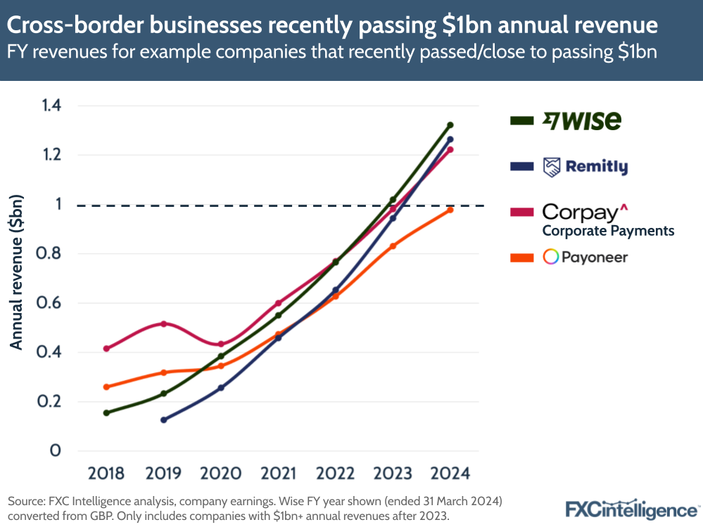 Other businesses in the cross-border payments space – Western Union, MoneyGram and PayPal to name just a few – have reported $1bn+ annual revenues for a long time. However, the solid growth of Payoneer, Remitly, Wise and Corpay in recent years speaks to some common themes in the market, though they are targeting different customer types.