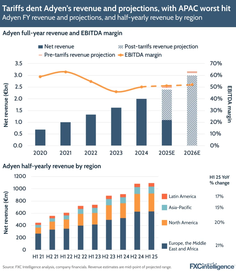 Adyen has announced its H1 2025 results, and while the European payments processor has continued to see growth, headwinds from the US tariffs and a weak dollar have seen it post lower-than-expected results and reduce its projections for FY 2025, prompting shares to tumble.