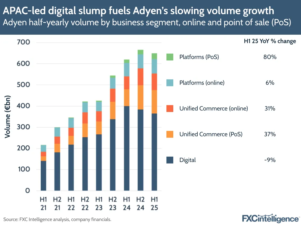 This is largely the result of the US tariffs, as well as the strong euro versus the dollar, with Adyen Co-CEO Ingo Uytdehaage highlighting that the company’s customers based in Asia-Pacific who are trading into the US were having a particularly strong impact on the company’s numbers. This was something Adyen saw more in Q2 as the tariffs began to bite, with the company anticipating it to continue across the rest of the year.