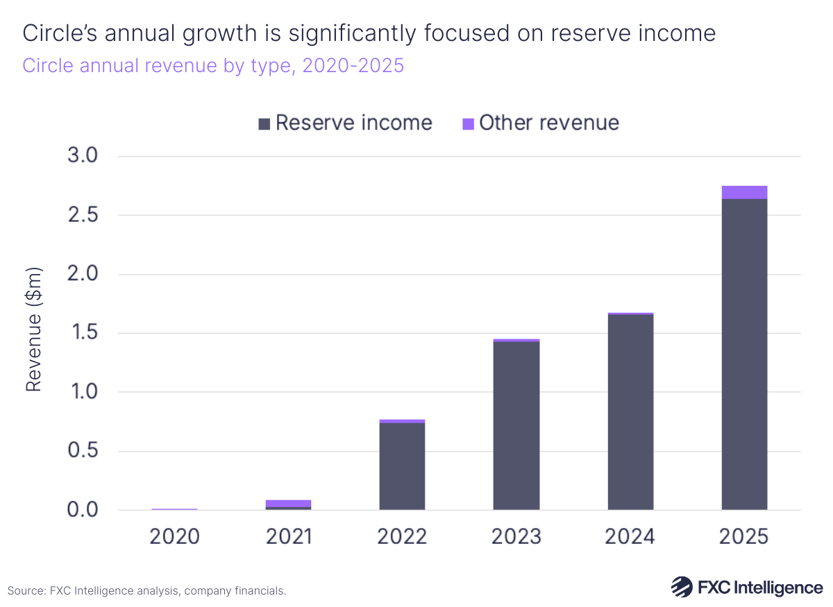 As a result Other Revenue took a 5% share of total revenue in the company’s Q4 2025 earnings, up from 0.6% in Q4 2024. In Circle’s full-year results, Other Revenue rose 624% to $110m, faster than reserve income growth and beating the company’s guidance of $90m-100m, and now takes a 4% share of Circle’s revenues.