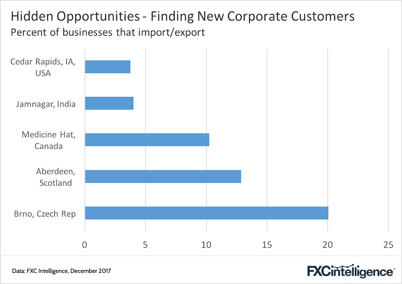 In order to simplify and focus their operations, payments companies often look at major cities and trading hubs. These are the places that are on everyone’s radar. But what about the smaller hubs? Based on our bottom-up data-mining of hundreds of thousands of individual SME importers and exporters around the globe, we’ve identified some of the best hidden pockets of opportunity.