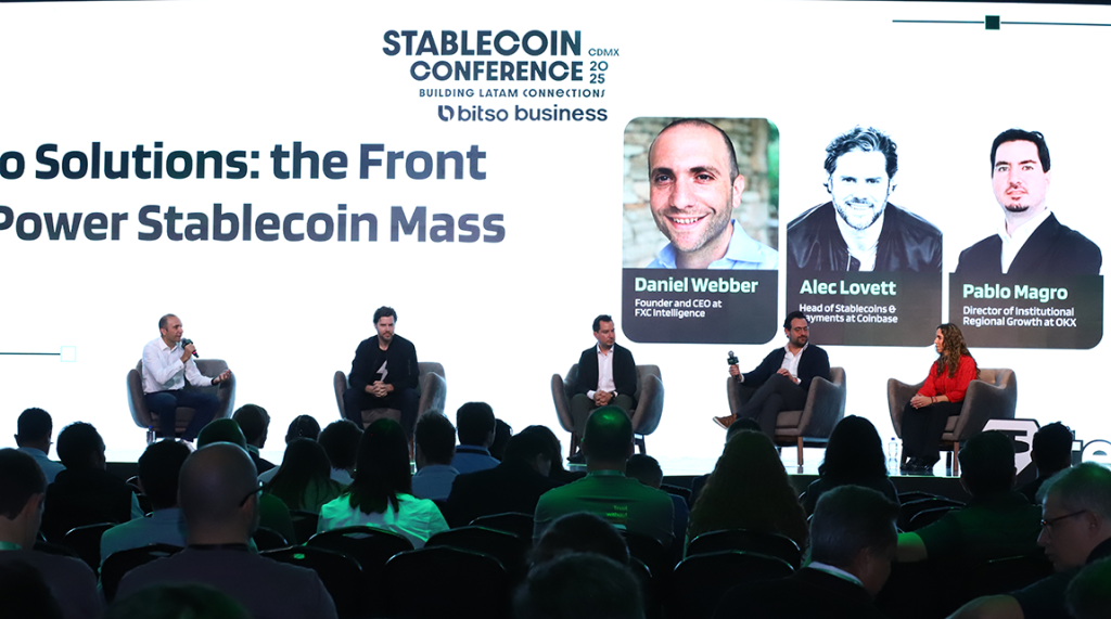 Joining me for the panel – called From Tokens to Solutions: the Front Lines Shift to Power Stablecoin Mass Adoption – were Coinbase’s Head of Stablecoins Alec Lovett; Bitso’s Chief Corporate Affairs Officer Felipe Vallejo; OKX’s Director of Institutional Regional Growth Pablo Magro; and Bullish’s Director of Institutional Sales Paola Urquidi.