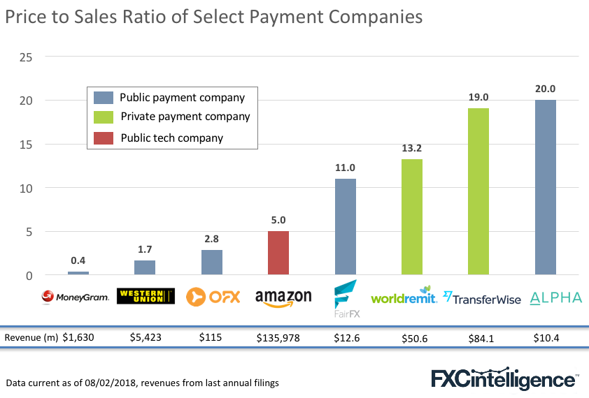 Transferwise meanwhile, which has revenues not far short of OFX, has a P/S ratio of 19 (although this is in the PE/VC world, not among stock market investors). Alpha FX Group, a specialist corporate FX and hedging player who went public last year, has the highest multiple of all on a base of just over $10m in revenue.