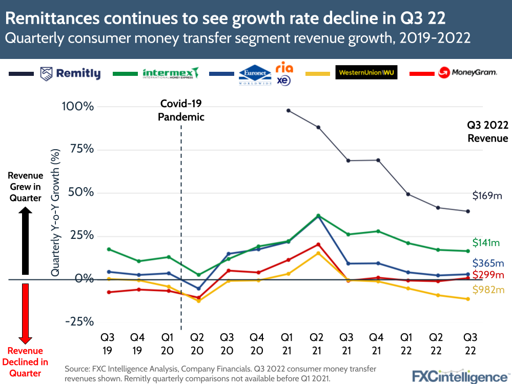 Leading remittance players have continued to experience slowing growth across their consumer money transfer revenues in Q3 2022. MoneyGram, Euronet, Intermex and Remitly all reported increased revenues, while Western Union saw a YoY decline due to headwinds such as the Russia/Ukraine war and its subsequent suspension of operations in Russia and Belarus.