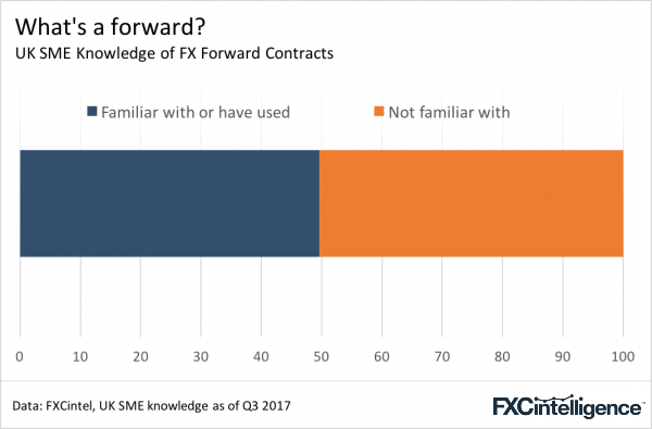 That said, it can be hard to sell such products to smaller companies that are unfamiliar with the nuances of FX risk. Looking through our latest data, just over half of UK SMEs are entirely unfamiliar with the concept of forward contracts.