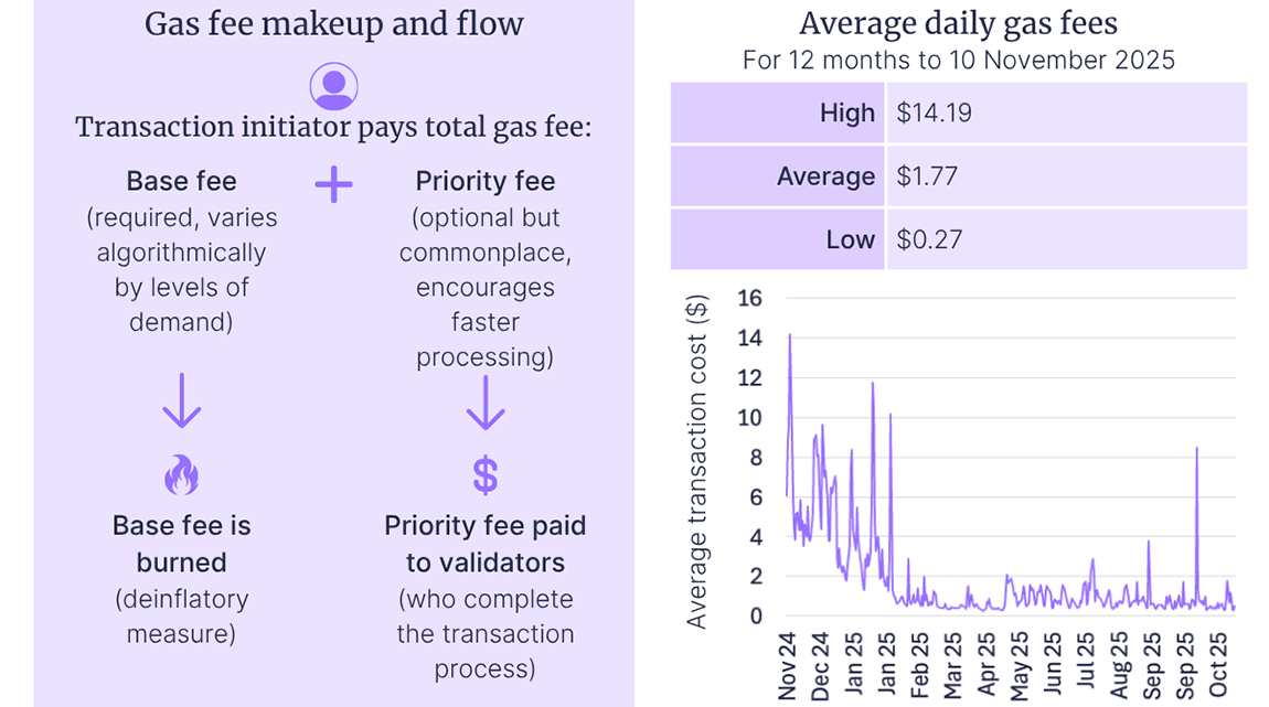Both increase in response to higher demands on the network, but in different ways: the base fee is varied algorithmically, while the priority fee is designed to move the transaction up the queue and get it processed faster. This variation can be significant, making the gas fee alone vary from tens of cents up to multiple dollars. However, these fees are not retained by the network itself. The base fee is burned (destroyed) as a disinflatory measure, while the priority fee is earned by the blockchain’s validators – typically organisations who maintain copies of the ledger, verify transactions and add them to the chain.