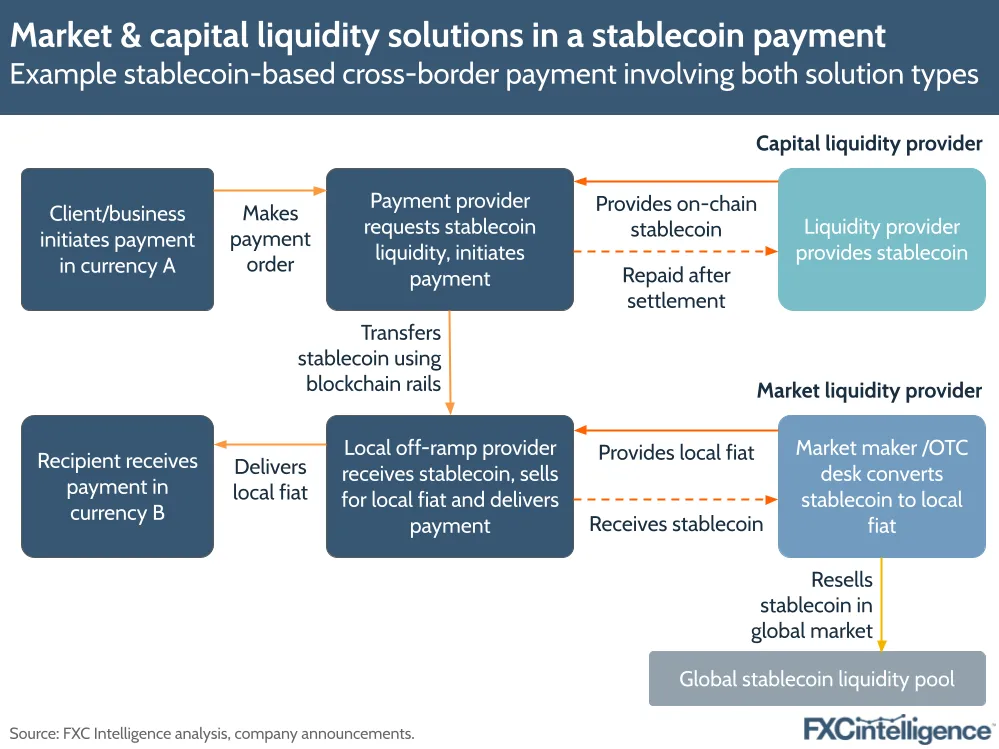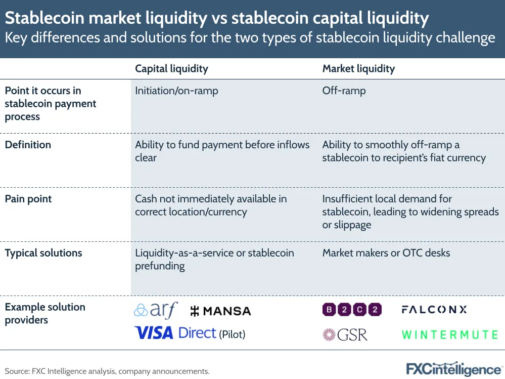 The term ‘liquidity’ gets used in a variety of ways within the stablecoin landscape, and two of the most common can be a source of considerable confusion. The first is market liquidity – the ability to on or off-ramp into or out of stablecoins in a given fiat currency at a stable, narrow spread (the difference between the buy and sell price). The second is capital liquidity – having the funds to cover a payout before incoming payments settle. Both see challenges within stablecoin cross-border settings and both have solutions – but differentiating between them is critical.