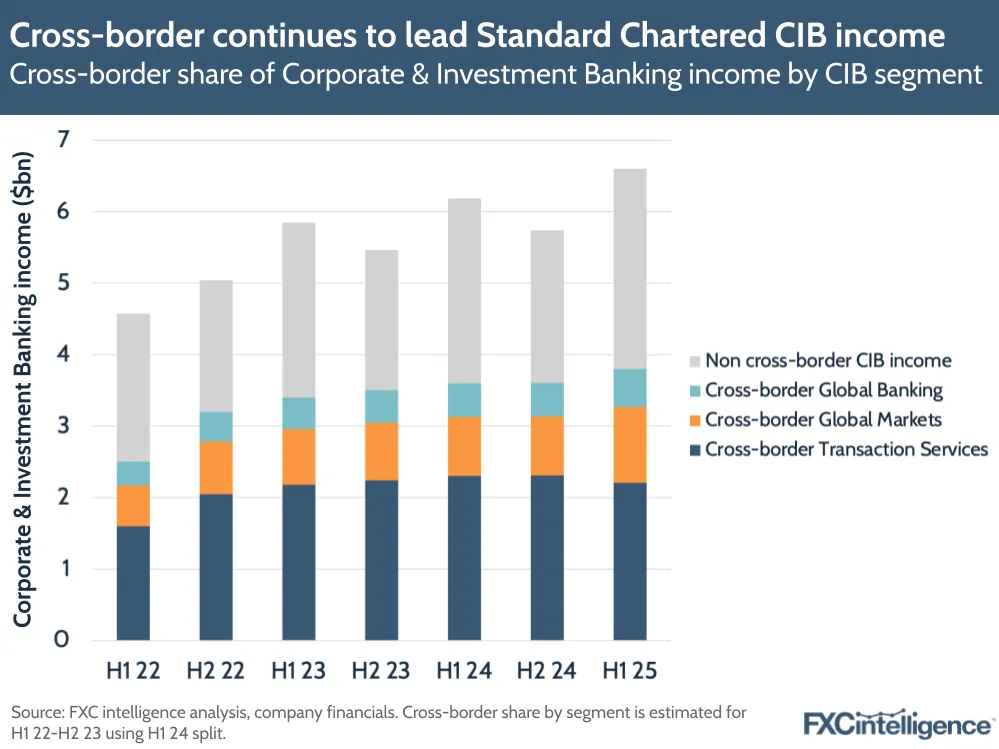 Standard Chartered only reports its cross-border (network) income for CIB on a half-yearly basis, which in H1 2025 reached $3.8bn, a 4% YoY increase, or 9% excluding interest rate impact. This represents a 58% share of CIB income, the same as H1 2024 although slightly down on H2 2024, with share historically being higher in the second half of the year. However, in a recent CIB investor day the bank said it was targeting 70% of CIB income to come from cross-border, meaning it still has some way to go to achieve this goal.