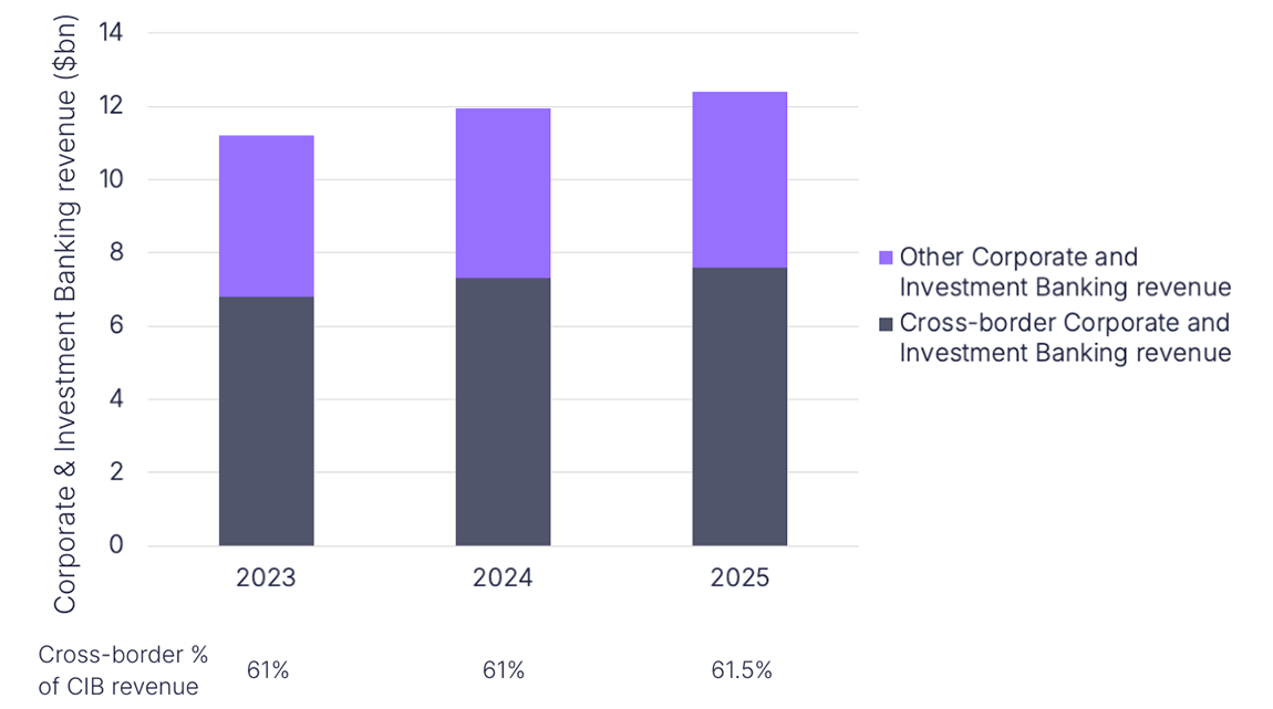 Cross-border revenue, which Standard Chartered refers to as network income, rose by 4% to $7.6bn in 2025, and has grown by a CAGR of 10% from 2019 to 2025. This meant it accounted for 61.5% of CIB revenue in 2025, slightly up from 61% the previous year. Standard Chartered restated its intention to drive network income to make up around 70% of CIB income in the medium term.