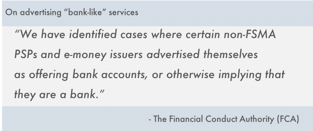 The FCA has made it clear that while it is very pro-innovation and all for companies delivering services that have typically been provided exclusively by banks, what they don’t want to see is companies trying to claim the trust (and protections) of a bank when they are not, in fact, a bank. Providers of multi-currency accounts, wallets, and virtual accounts will all have to be looked at.