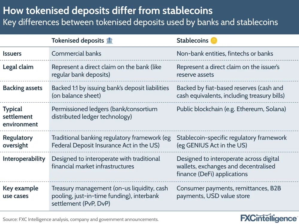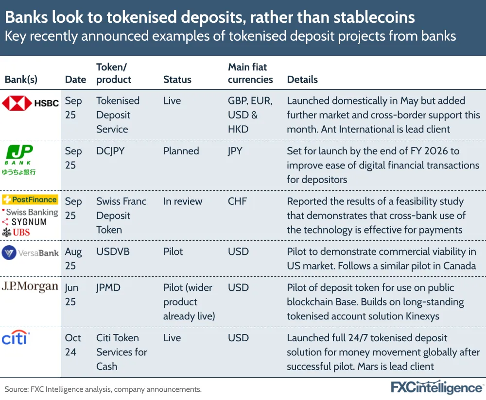 Stablecoins may have set the cross-border payments world alight in recent months, but on the bank side, it is tokenised deposits, a cousin technology of the digital currency, that is often translating into real-world projects.