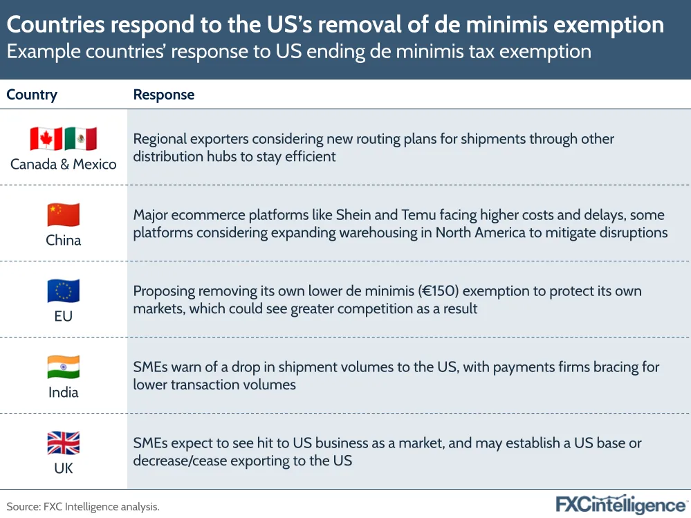 There has been a mixed response on the extent to which the de minimis exemption could affect cross-border payments. India-based processor BriskPe told the Economic Times that it was bracing itself for cross-border shipment volumes declining by 15-25% from India to the US, causing “friction” in consumer spending that could then affect payments companies facilitating these transactions.