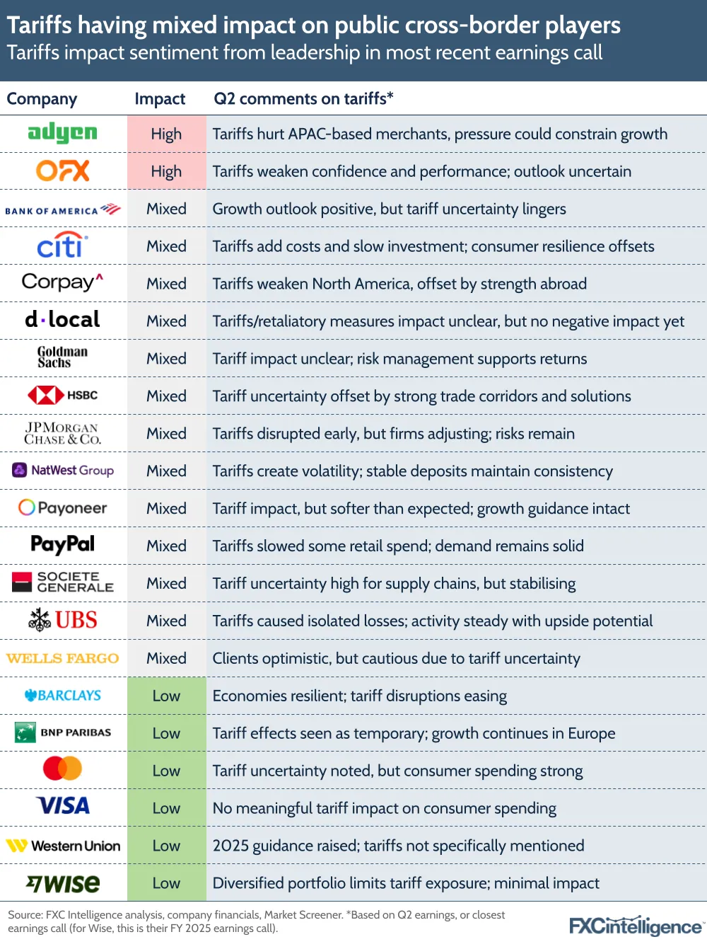 Having said this, as the exemption is specifically focused on low-value imports, it is likely to only really have an impact on cross-border payments providers focused on marketplaces with small-ticket transactions. Notably, the majority of public cross-border payments companies did not refer to the lifting of the de minimis exemption in their most recent earnings calls, with the exception of Payoneer, which said that it expects to see “no impact” from this specific change. However, the wider impacts of US tariffs were discussed in more detail.