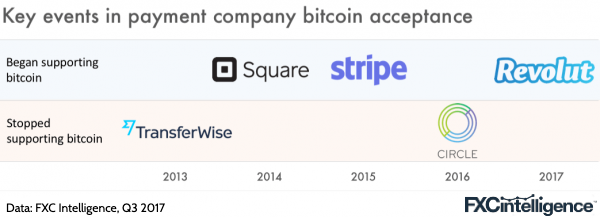 While Transferwise and Circle have already embraced and then distanced themselves from bitcoin, payment processors such as Square and Stripe have helped enable wider consumer adoption.