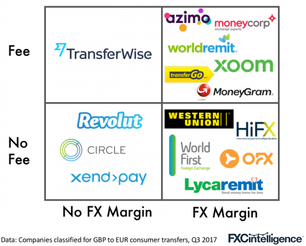 International payment companies profit in primarily two ways: by adding an FX margin (sometimes small, sometimes large) on top of their wholesale FX rate, or charging a fee for each money transfer. Or charging both. Or, apparently, none. Below we show how a range of payment companies are focusing their business models.