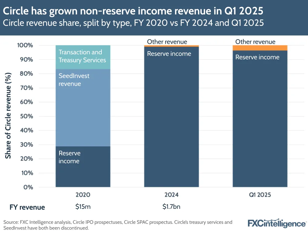 Circle’s revenue mix has evolved significantly over the past few years. In 2020, the year before its failed SPAC listing, Circle gained much of its revenue from its then-share of crowdfunding platform SeedInvest, as well as its since-closed treasury services business line.