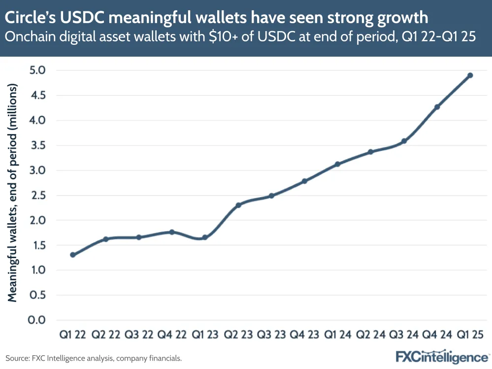 Circle is also seeing success in growing the number of users of USDC. Meaningful wallets – blockchain-based digital wallets holding $10 or more in USDC – have grown significantly in recent months, climbing 15% quarter-on-quarter and 57% year-on-year to 4.9 million in Q1 2025.