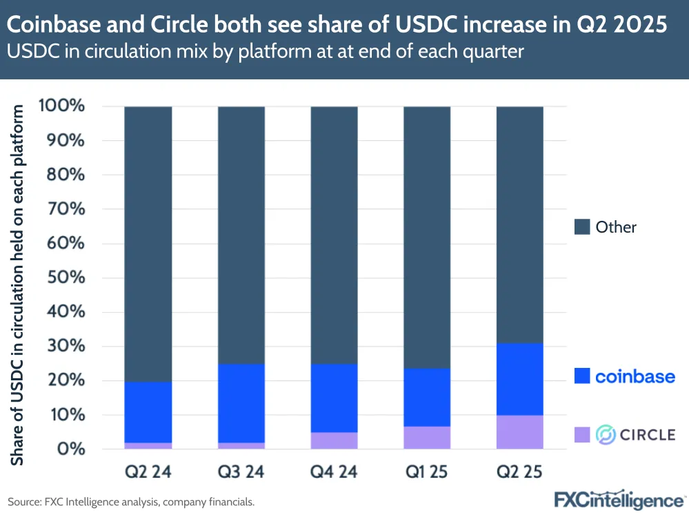 For Circle, it is therefore more desirable to increase the share of USDC held on its own platform, and here the company has made significant gains. While its share still remains small, it has reached double figures for the first time, climbing from 2% in Q2 2024 to 10% in Q2 2025.