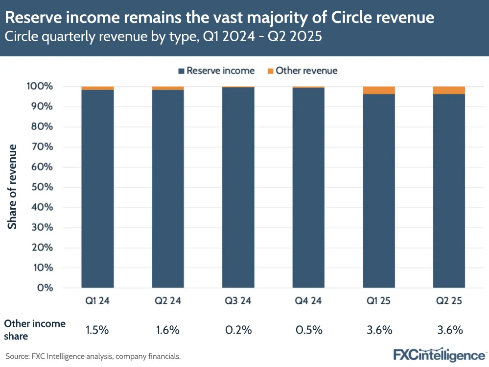 Meanwhile, Circle remains highly reliant on reserve income, the interest income it receives from the reserves it holds to back the USDC in circulation. As of Q2 2025, this accounted for over 96% of its overall revenue, and means the company is highly exposed to changes in interest rates, which has led it to previously provide very broad guidance for its FY performance based on different moves in interest rates.