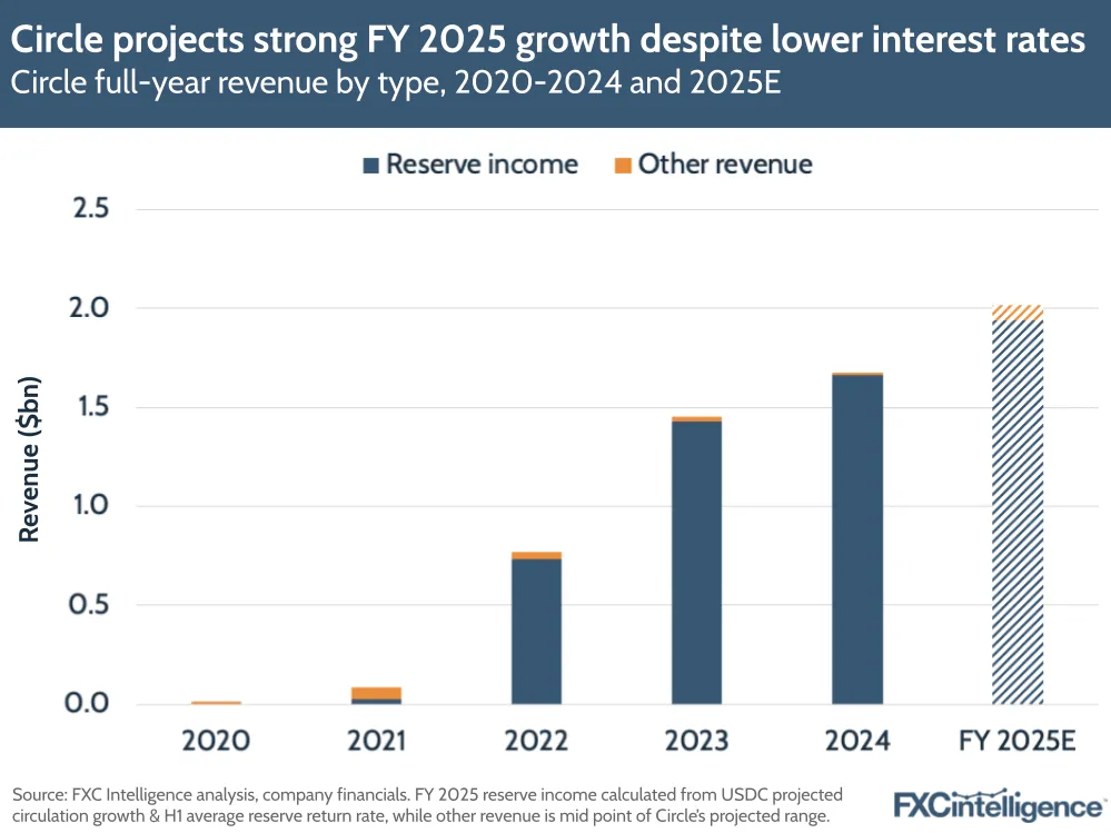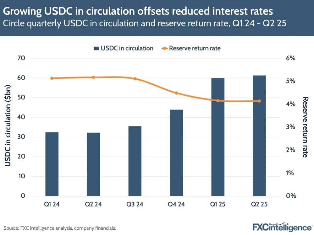 With the interest rate environment having been less favourable in the last few quarters, Circle has seen its reserve return rate drop from the levels it saw in H1 2024. However, this drop has been offset by significant growth in USDC in circulation, which has meant that reserve income has nonetheless climbed.