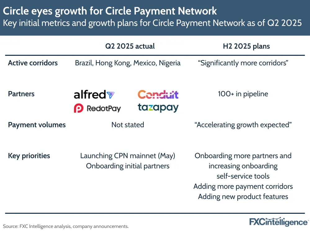 Circle also reported that CPN is initially active on only four corridors – Hong Kong, Brazil, Mexico and Nigeria – although the company plans to roll out support for significantly more in the latter half of this year. It expects to see this, along with the increased number of partners, drive accelerated growth across H2 2025.