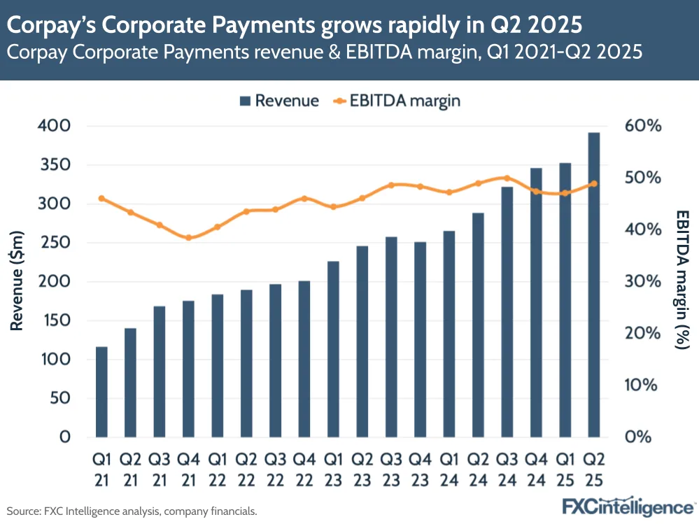 Corporate Payments’ EBITDA rose 36% to give a margin of 49%, flat on last year and just lower than Corpay’s overall EBITDA margin of 52%.
