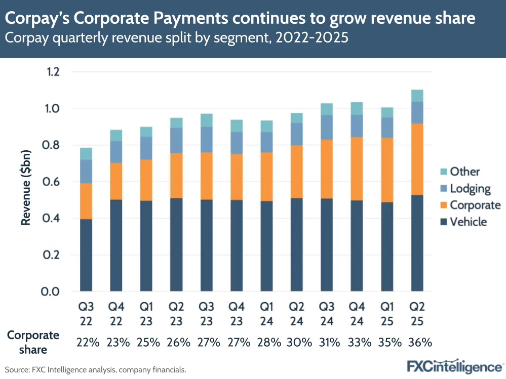 As a result of strong growth, Corporate Payments revenue continues to account for a larger and larger share of Corpay’s overall revenue, taking a 36% share against 30% in the same period last year. Vehicle Payments continues to account for the highest share at 48%, though it grew just 3% in the quarter.