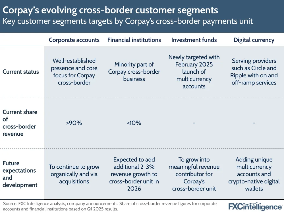 Corpay has continued to evolve the cross-border segments it is targeting with the addition of digital asset and stablecoin firms. This includes Circle, which Corpay has partnered with to add USDC across Corpay’s pay-in and pay-out rails for businesses. Through the deal, businesses will be able to manage and store USDC in Corpay-branded digital wallets powered by Circle, as well as fund transactions to more than 80 countries (with payouts enabled in local fiat currencies).