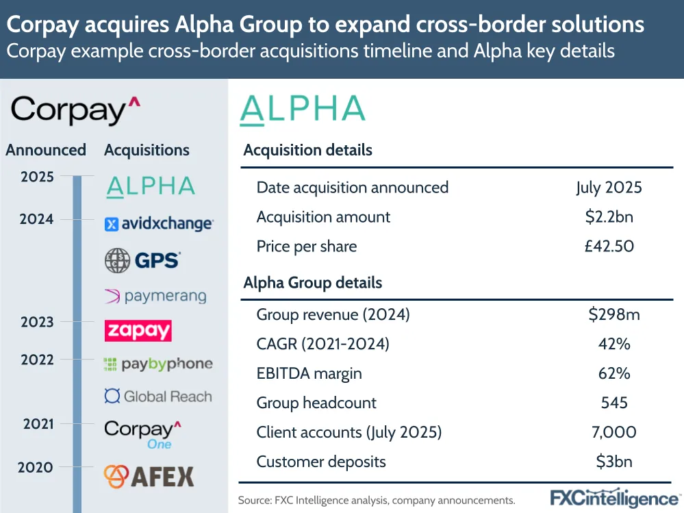 Corpay noted in its acquisition materials that Alpha has seen consistent growth over the last few years, with annual revenues of $298m in 2024 driven by a CAGR of 42% over 2021-2024. It has also seen its EBITDA grow by around four times over the past three years, giving an impressive margin of 62% for 2024.