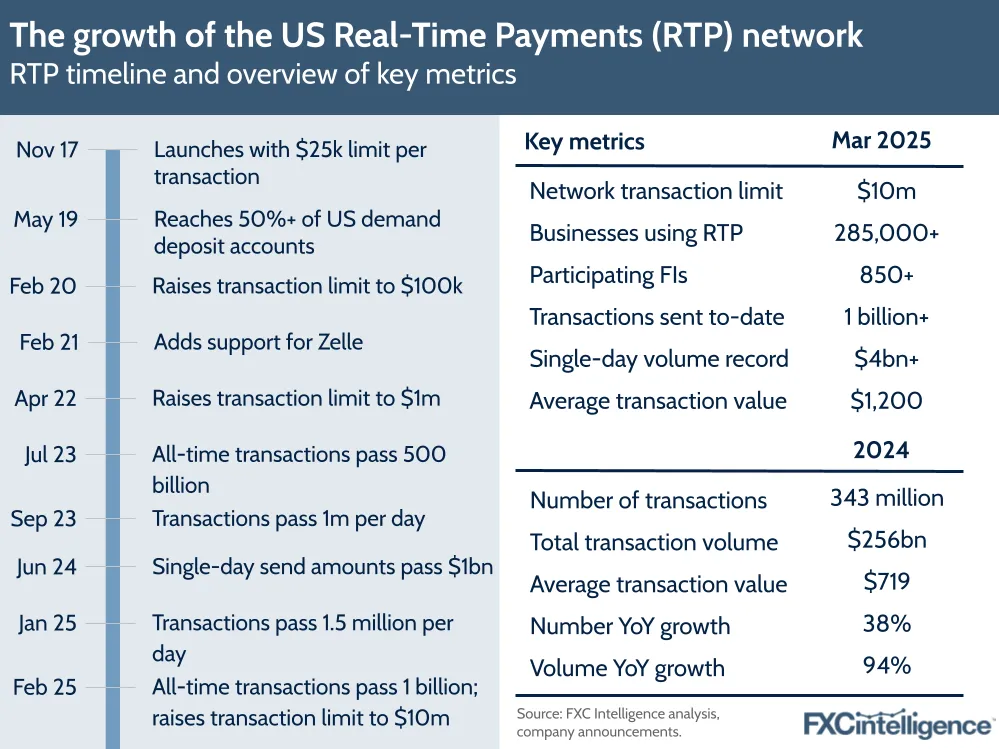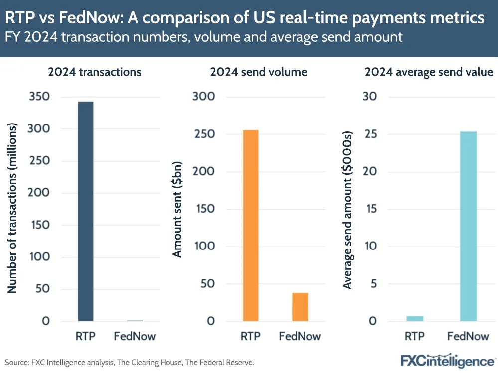 This has seen RTP grow the number of transactions it handles from around 172 million in 2022, with flows of $75.7bn, to 343 million transactions with flows of $256bn in 2024. This remains “a drop in the ocean” relative to other parts of the US payments network – CHIPS, for example, settles $1.8tn in domestic and international payments each day – but it represents a significant improvement on “a very low starting point”.