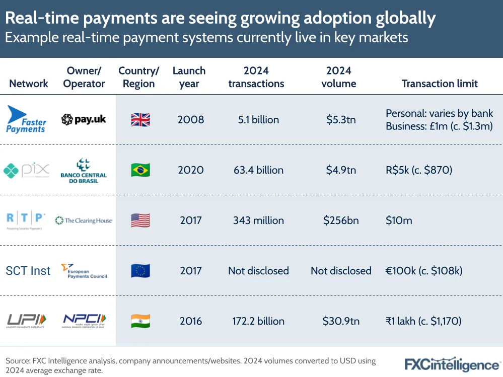 However, use cases and adoption are by no means consistent. India has the largest real-time payments market globally through UPI, which Warsop says “has grown incredibly fast” since its 2016 launch. Meanwhile, Brazil’s Pix, while smaller, has seen similarly strong growth since its launch in 2020.