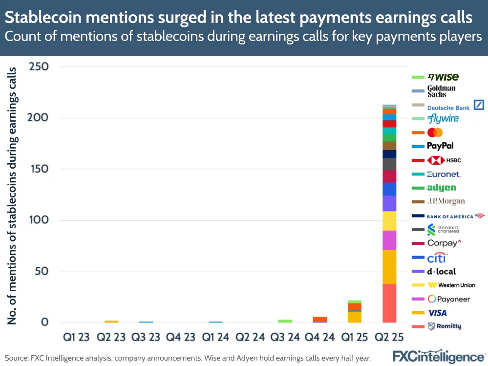 Visa saw the second-highest mentions in Q2, having had the highest number of mentions in Q1 and being one of only a handful of players to have mentioned stablecoins during their earnings calls before 2025.