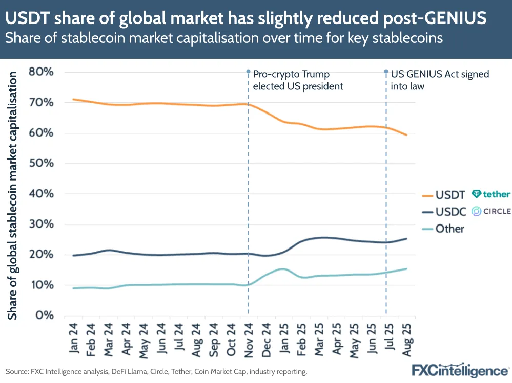 USDT had already been treated with greater caution by many Western financial players than its US-based competitor USDC due to differences in transparency, headquarters and reserve backing, however, the passing of the GENIUS Act in July has had a more pronounced impact on the use of USDT.
