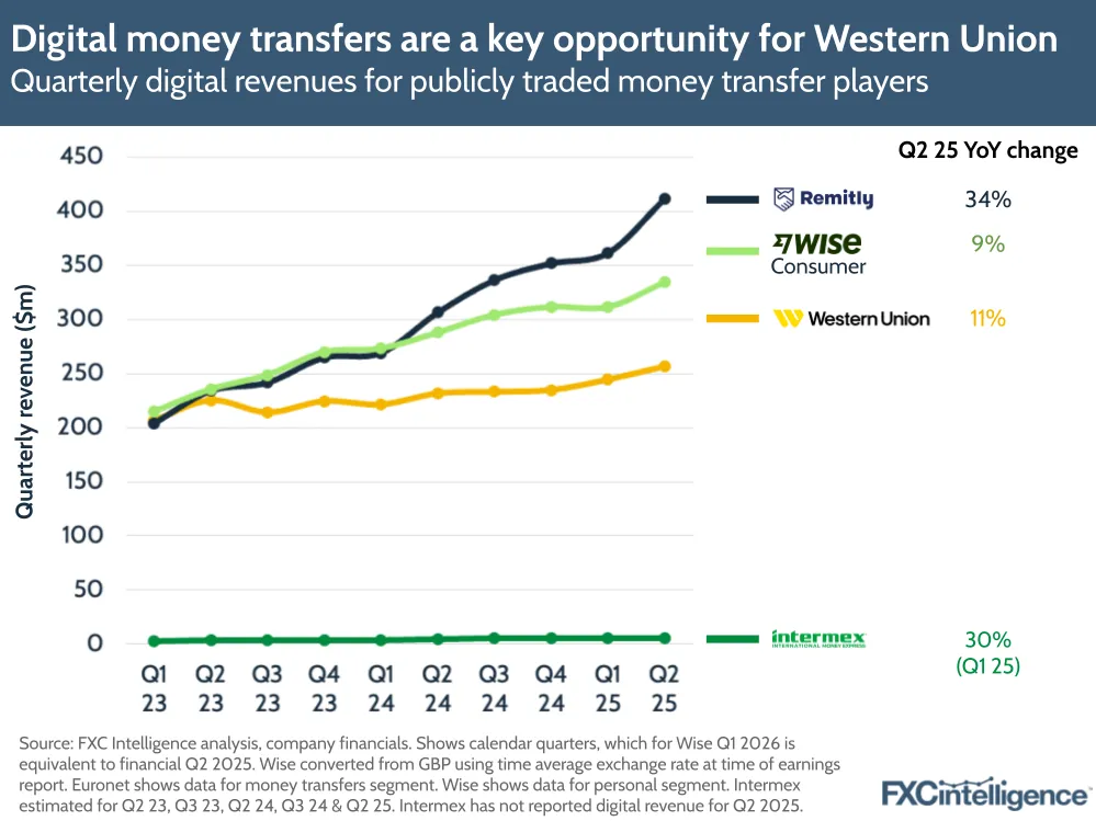 This places Intermex’s digital revenue far below that of other competitors, with Western Union reporting digital revenue of around $257m in Q2 2025. However, the remittance giant did highlight digital as a key growth opportunity for Intermex in its investor call on the acquisition, particularly given the anticipated increase in digital in response to the remittance tax.