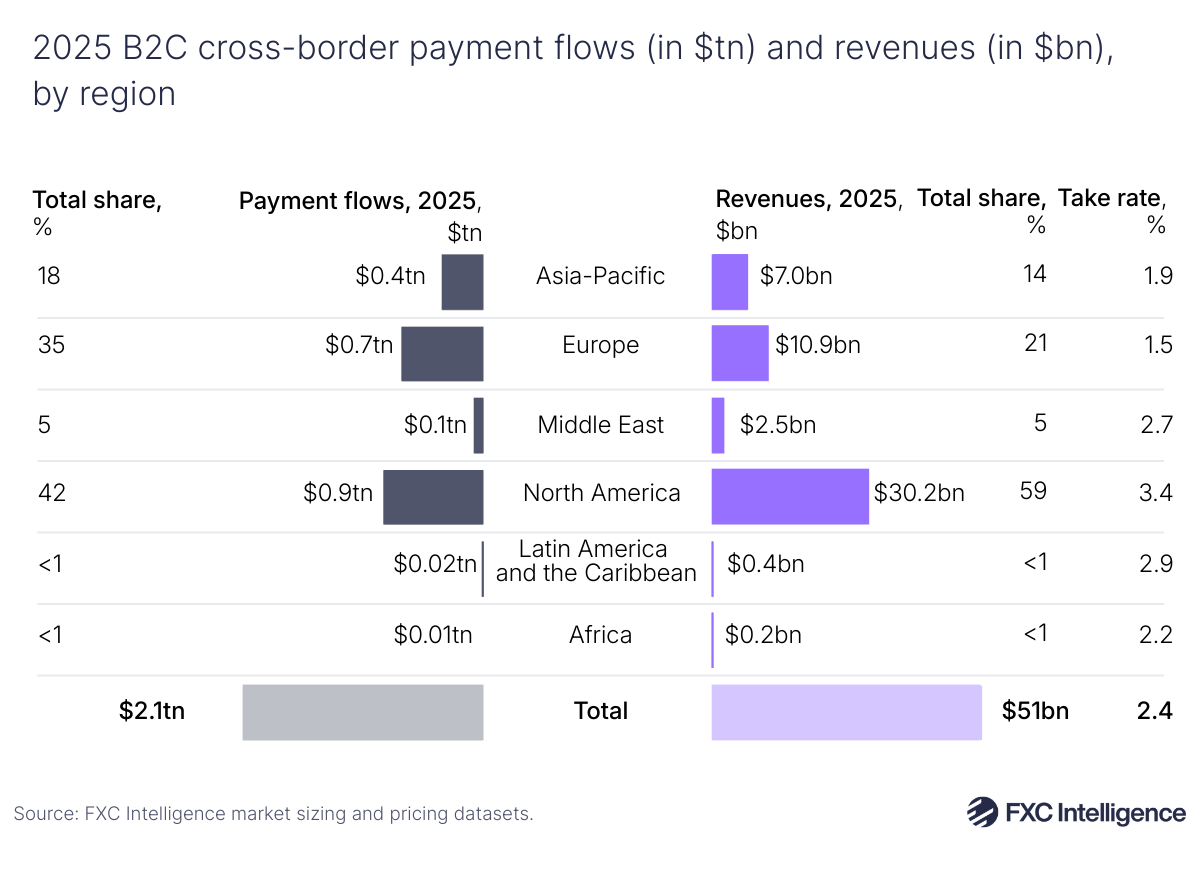 Like B2B revenue, B2C monetisation is not uniform across different regions, with over 75% of cross-border B2C flows originating from North America and Europe.